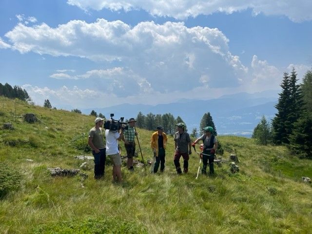 Bei bestem Bergwetter strahlten das GPS-Team und die Vertreter des Almwirtschaftsvereins mit der Sonne um die Wette, als Barbara Altersberger vom ORF das Teilprojekt „Almwirtschaft – Erhaltung von Natur- und Kulturgut“ besuchte. Dieses Beschäftigungsprojekt, das aus Mitteln des Europäischen Sozialfonds und des AMS finanziert wird, ist Ergebnis einer langjährigen und erfolgreichen Kooperation mit dem Kärntner Almwirtschaftsverein.
